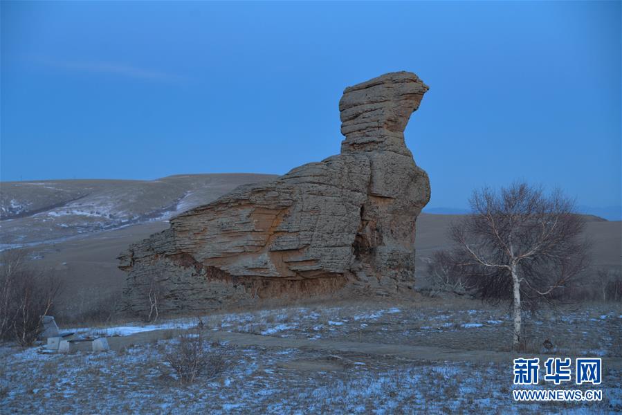 这是11月25日拍摄的克什克腾石阵景区,这块石头名为“鲲鹏落草原”。 克什克腾石阵景区位于内蒙古赤峰市克什克腾旗,是国家5A级景区。冬日黄昏,在落日和晚霞的映衬下,克什克腾石阵景区一派壮美景象。 新华社记者 魏婧宇 摄