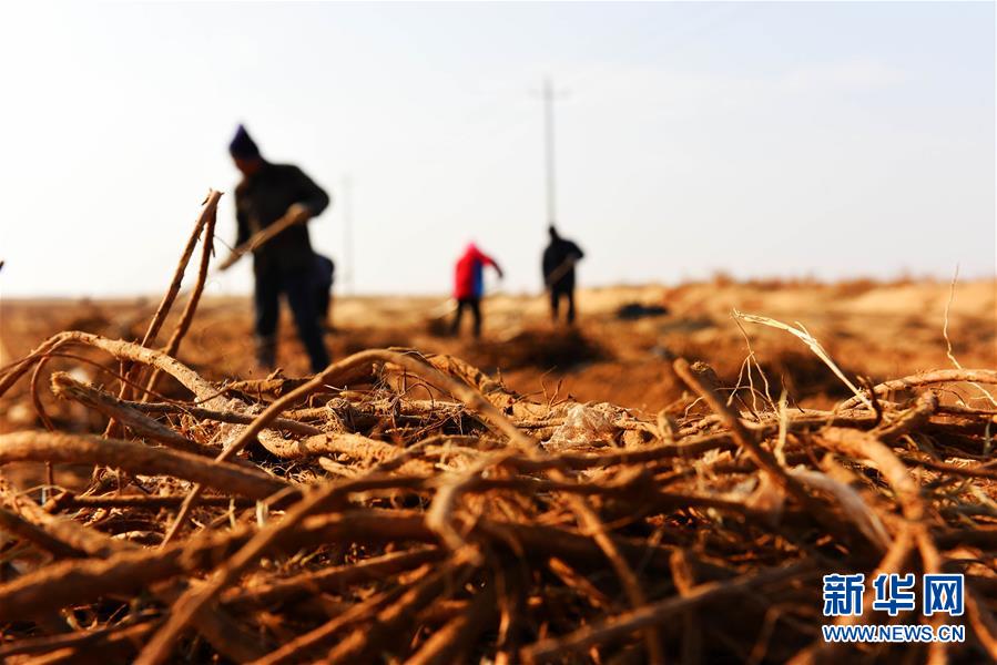 11月21日,在内蒙古磴口县沙金苏木,内蒙古王爷地苁蓉生物有限公司工人在收获甘草。新华社记者 李云平 摄