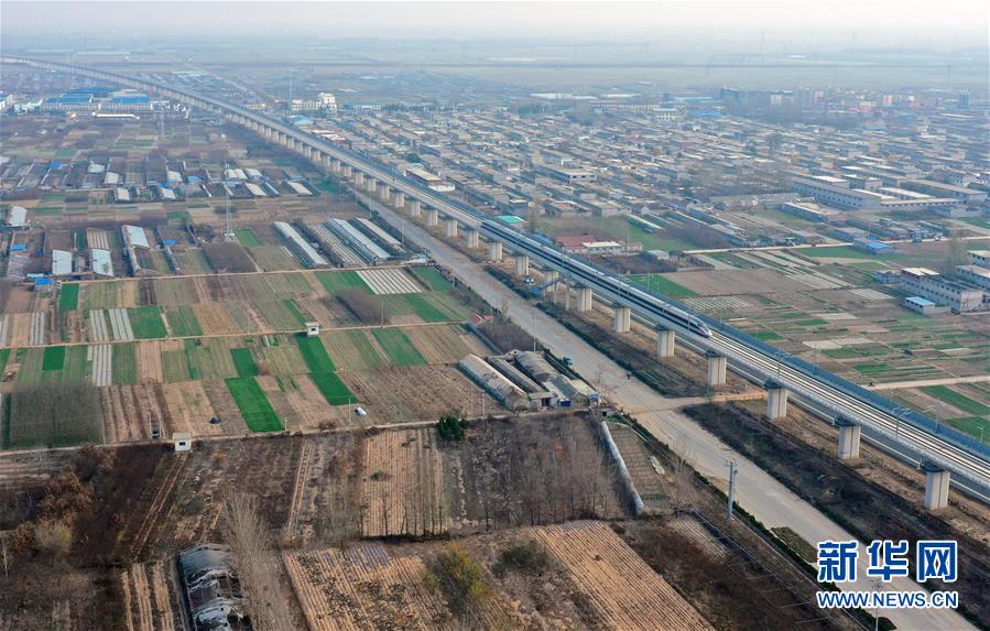 11月26日无人机拍摄的临沂北至日照高速列车在临沂市兰山区境内通行。 当日,山东日照至河南兰考高速铁路日照至曲阜段正式开通运营,这是沂蒙革命老区首次接入全国高铁网。 新华社记者 朱峥 摄