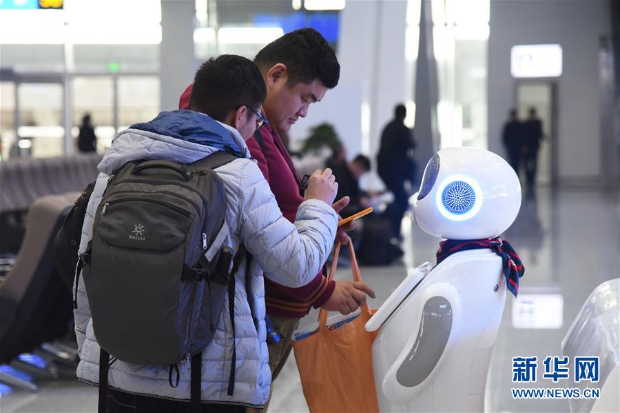 11月26日,乘客在临沂北站利用智能机器人查询车票信息。 当日,山东日照至河南兰考高速铁路日照至曲阜段正式开通运营,这是沂蒙革命老区首次接入全国高铁网。 新华社记者 王凯 摄