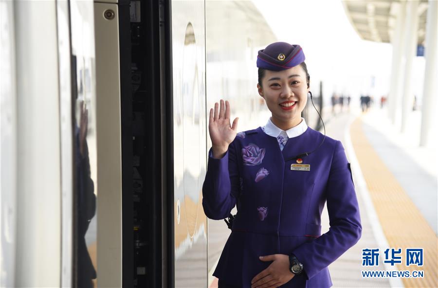 11月26日,在临沂北站,山东日照至河南兰考高速铁路日照至曲阜段列车的列车长闫妮在迎接旅客。 当日,山东日照至河南兰考高速铁路日照至曲阜段正式开通运营,这是沂蒙革命老区首次接入全国高铁网。 新华社记者 王凯 摄