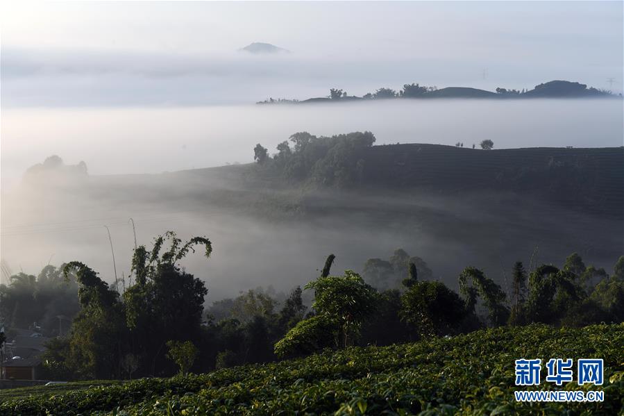 云南省普洱市思茅区永庆茶园远山晨曦云海景观(11月27日摄)。 冬季里,云南省普洱市思茅区永庆茶园周边山峦云雾飘渺,景色如画。 新华社记者 杨宗友 摄