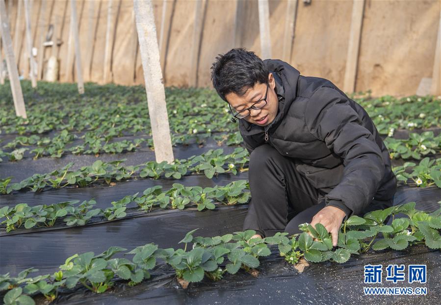 11月27日,农户在王家庄乡蔬菜种植示范园区的大棚内查看草莓长势。 近年来,山西省原平市积极调整农业产业结构,通过“合作社+农户”的模式,大力发展设施农业。位于原平市王家庄乡的蔬菜种植示范园区,占地面积800余亩,可带动周边3个村的600多户农户稳定增收。 新华社记者 杨晨光 摄