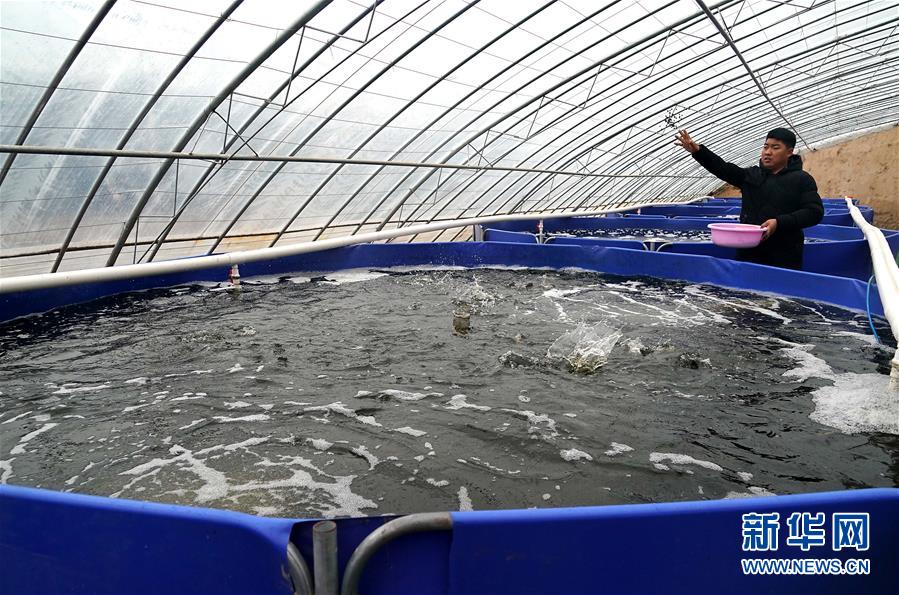 11月27日,工作人员在开封市祥符区西姜寨乡鱼菜共生基地投喂鱼食。 2019年以来,河南省开封市祥符区西姜寨乡在推进农业现代化工作中,推广鱼类和蔬菜共同养种,通过水循环系统将养鱼产生的粪便等微生物进行分解,转化为蔬菜生长所需的营养物质,实现“养鱼不换水,种菜不施肥”的生态种养模式,取得良好经济效益和生态效益。 新华社记者李安摄