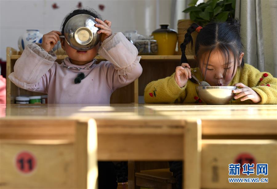 4岁的孙月月(左)和周诗茹在盐池县高沙窝镇幼儿园享受免费营养午餐(11月26日摄)。 近年来,宁夏吴忠市盐池县针对农村幼儿和特殊教育学生实施营养改善计划,普及免费营养午餐,提高营养膳食质量,保障孩子们的饮食安全。目前,盐池县全县8所农村幼儿园和1所特殊教育学校已全部纳入营养改善计划,1700余人受益。 新华社记者 冯开华 摄