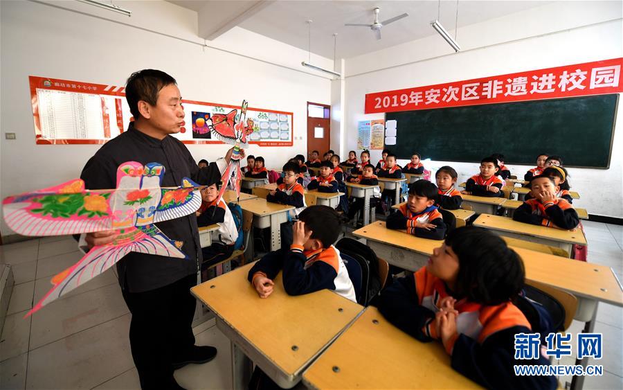 11月27日,安次区第什里风筝艺人在为廊坊市第十七小学学生介绍风筝知识。 当日,河北省廊坊市第十七小学开展“非遗进校园”主题活动,邀请民间非遗传承人走进校园,展示非遗技艺。近年来,廊坊市安次区在中小学、幼儿园开设非遗课程,培养学生对传统文化的兴趣。 新华社记者 王晓 摄
