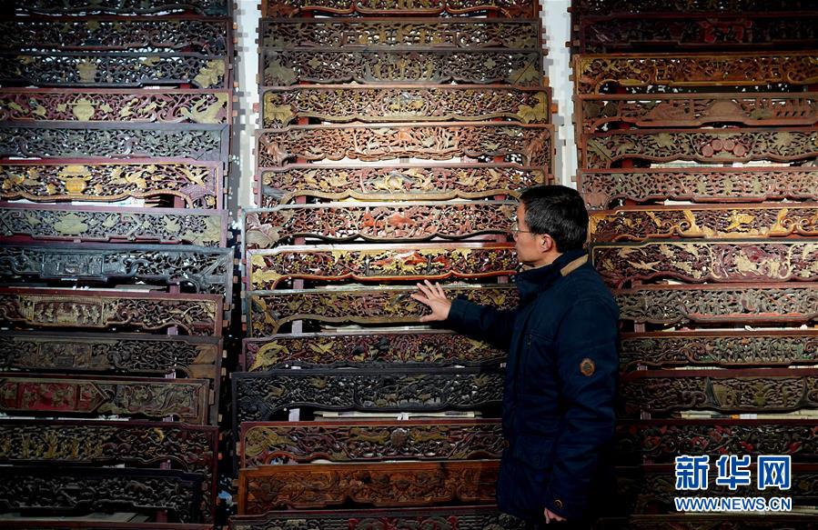 11月27日,张俊涛在“汴京灯笼张”彩灯展览馆查看传统木雕,进行灯笼纹样研究。新华社记者 李安 摄