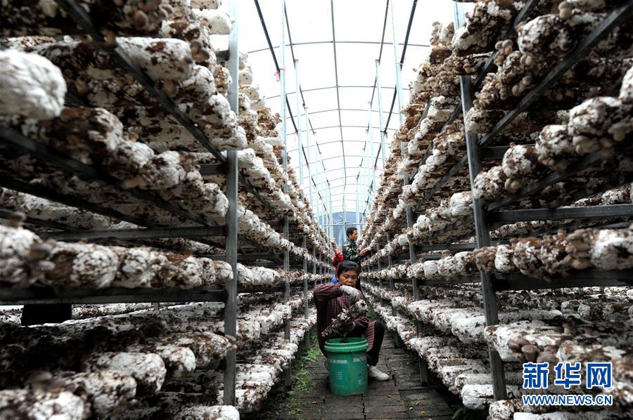 11月27日,在荔浦市花篢镇南源村香菇现代化种植示范基地,香菇种植户在采摘香菇。 广西荔浦市花篢镇西北的南源村是荔浦最边远的水库移民村。全村496户,其中建档立卡贫困户63户。2016年起,花篢镇先后在南源村、大江村建成了占地40多亩、种植规模达40万筒的香菇现代化种植示范基地。 南源村香菇集体经济的发展,带动周边村屯和农户加入到香菇种植中来,为贫困户在家门口提供就业岗位。当地依托产业精准施策,发展壮大村级集体经济,并与电子商务相结合,构建“村委+电商+农特产品”的电子营销模式,通过蘑菇种植,增加贫困户的经济收入,夯实产业脱贫致富道路。 新华社记者 冯为民 摄