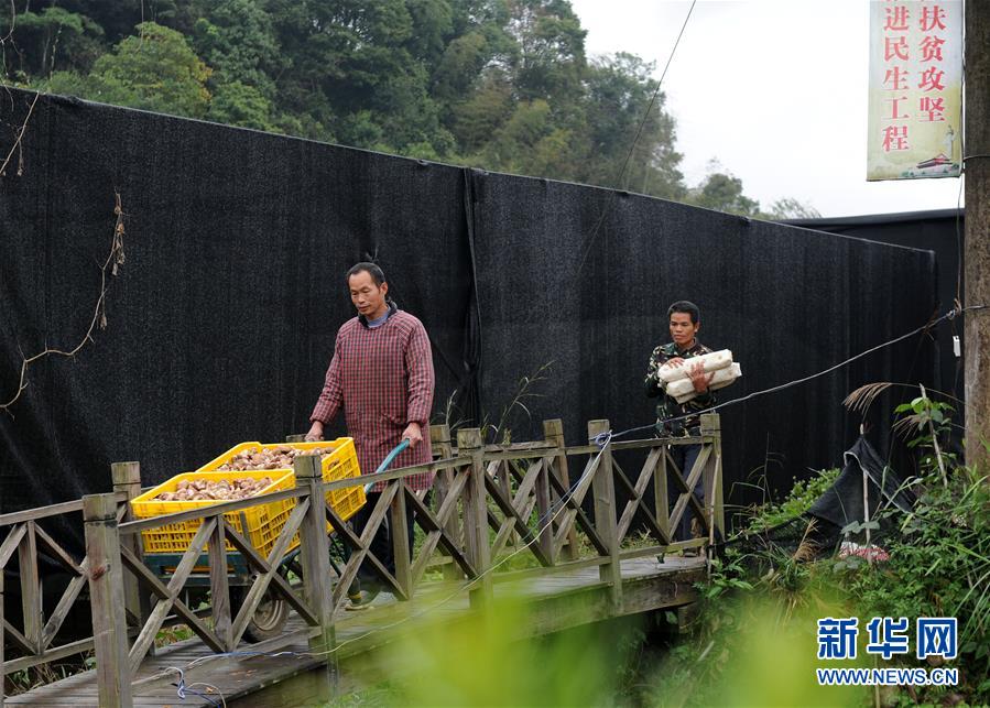 11月27日,在荔浦市花篢镇南源村香菇现代化种植示范基地,种植户运送刚收获的香菇。 广西荔浦市花篢镇西北的南源村是荔浦最边远的水库移民村。全村496户,其中建档立卡贫困户63户。2016年起,花篢镇先后在南源村、大江村建成了占地40多亩、种植规模达40万筒的香菇现代化种植示范基地。 南源村香菇集体经济的发展,带动周边村屯和农户加入到香菇种植中来,为贫困户在家门口提供就业岗位。当地依托产业精准施策,发展壮大村级集体经济,并与电子商务相结合,构建“村委+电商+农特产品”的电子营销模式,通过蘑菇种植,增加贫困户的经济收入,夯实产业脱贫致富道路。 新华社记者 冯为民 摄