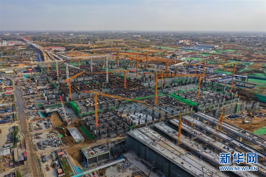 11月7日无人机拍摄的建设中的京雄城际铁路雄安站。新华社记者 邢广利 摄
