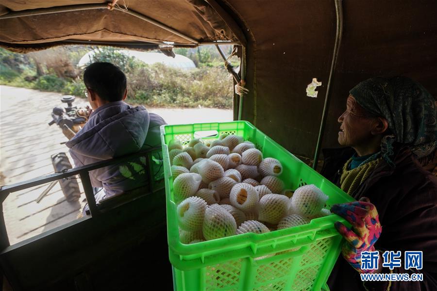 11月28日,在云南省石林彝族自治县西街口镇路花村,张建伟(左)和母亲黄兰芳(右)在运送采摘下来的人参果。 新华社记者 程敏 摄