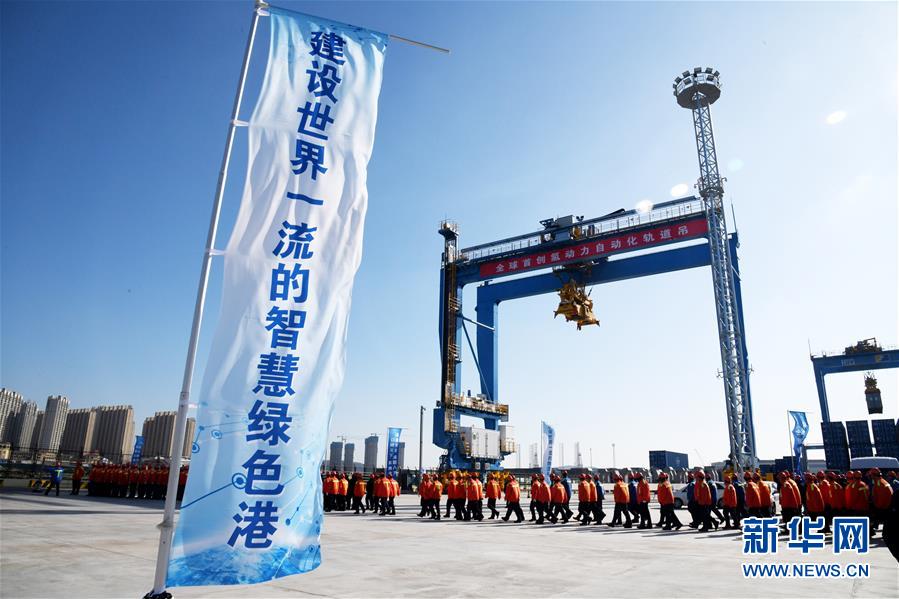 11月28日在青岛港全自动化码头(二期)现场拍摄的氢动力自动化轨道吊。 当日,山东港口青岛港全自动化码头(二期)投产运营。该项目推出了山东港口自主研发、集成创新的氢动力自动化轨道吊、5G+自动化技术等6项全球首创科技成果。 新华社记者 李紫恒 摄