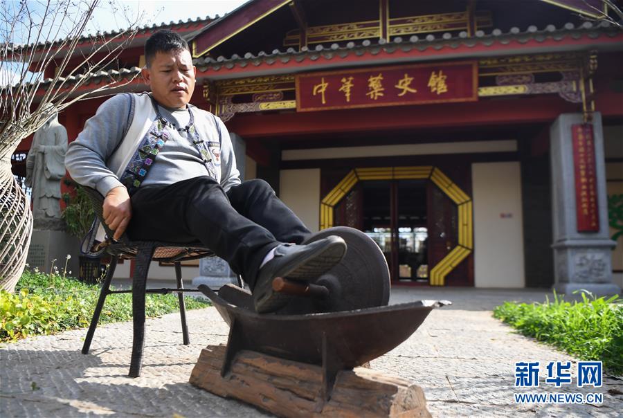 石林杏林大观园中医文化展览馆工作人员展示如何碾制三七粉(11月28日摄)。 新华社记者 薛宇舸 摄