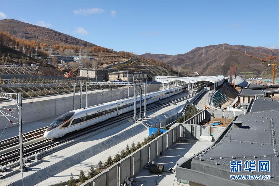 10月25日,列车行驶在河北省张家口市。 目前,京张高铁沿线各车站即将竣工,为下一步运行实验奠定了基础。 新华社记者 杨世尧 摄
