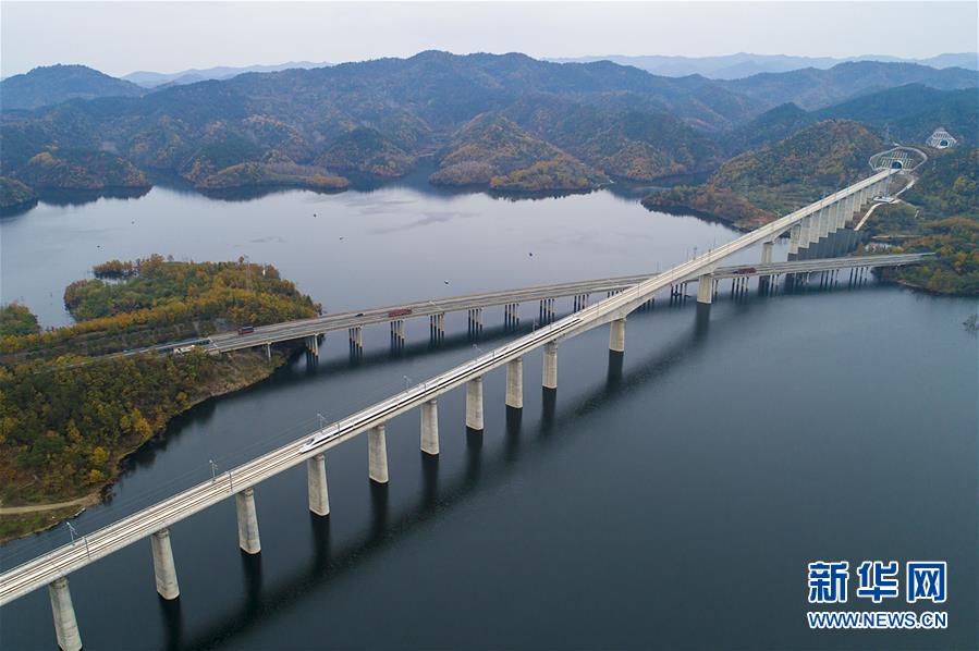 汉十高铁试运行期间,一趟列车从丹江口水库上驶过(11月26日无人机航拍)。 11月29日,武汉至十堰高速铁路开通运营,将秦巴山连片特困区拉入全国高铁网,武汉至随州、襄阳、十堰用时均压缩一半,极大方便沿线群众出行。 新华社记者 熊琦 摄