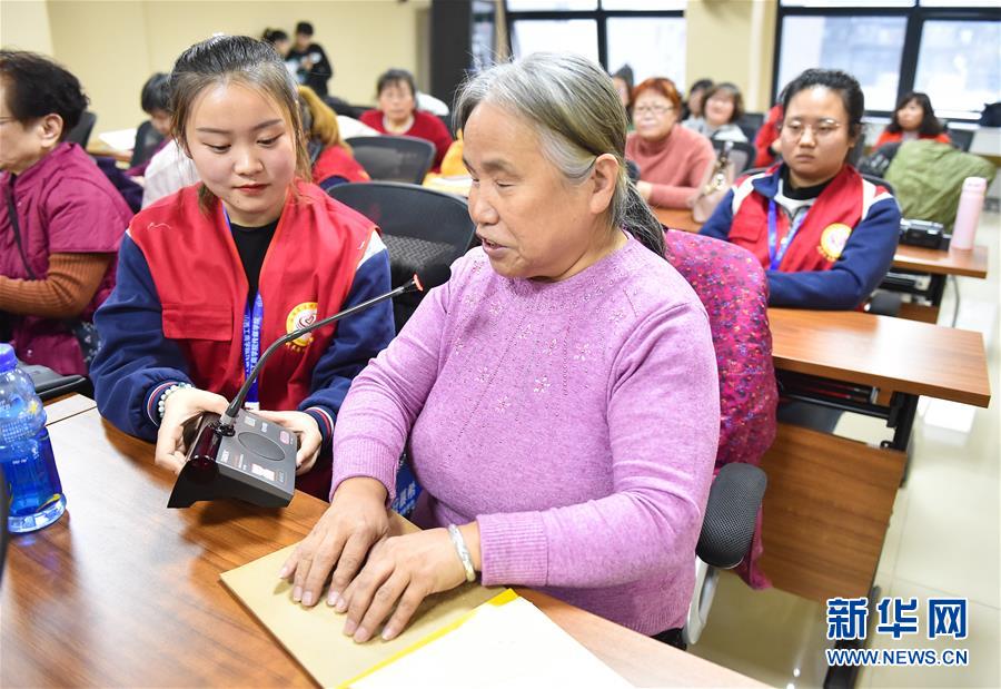 11月28日,一名盲人在活动上朗诵诗歌。新华社发(柴婷 摄)