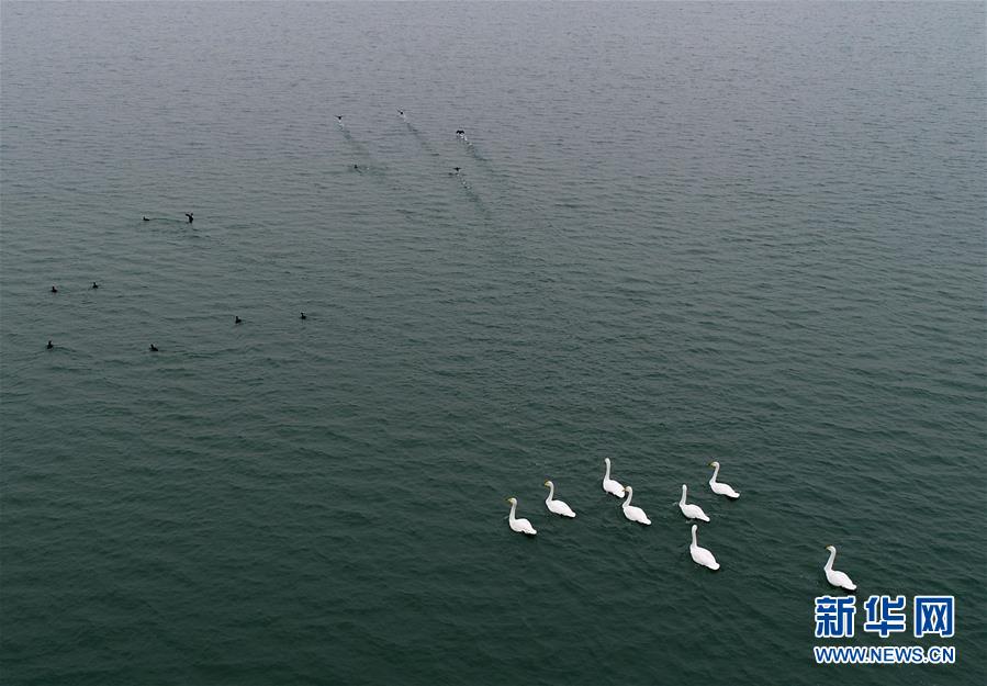 候鸟在红碱淖湖面上游弋(11月28日无人机拍摄)。 冬日,位于陕西神木市的红碱淖别有一番景致,一群越冬候鸟到访,为这个中国最大的沙漠淡水湖增添了活力与生机。 新华社记者 邵瑞 摄