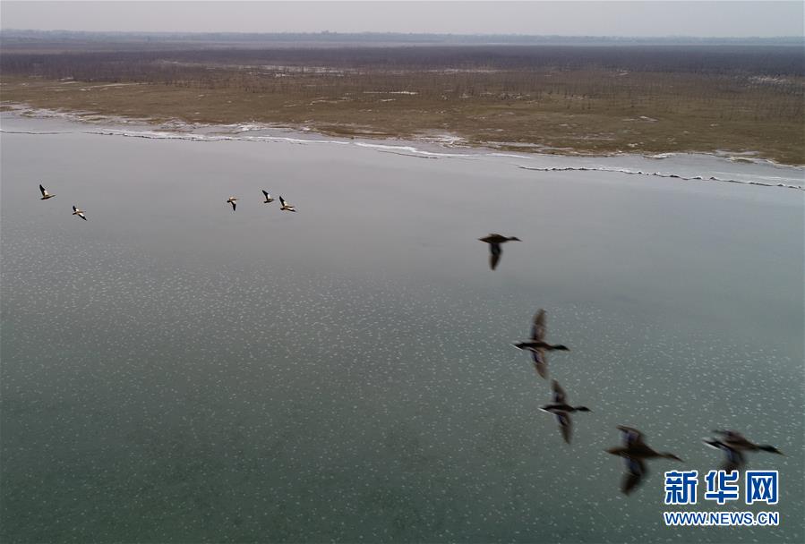 越冬候鸟飞过红碱淖湖面(11月28日无人机拍摄)。 冬日,位于陕西神木市的红碱淖别有一番景致,一群越冬候鸟到访,为这个中国最大的沙漠淡水湖增添了活力与生机。 新华社记者 邵瑞 摄