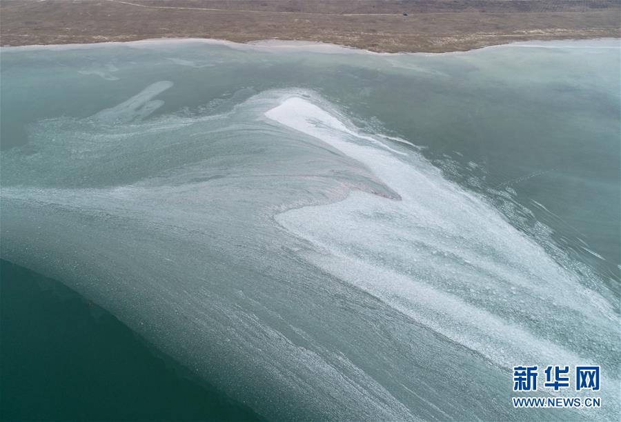 俯瞰结冰的红碱淖湖面(11月28日无人机拍摄)。 冬日,位于陕西神木市的红碱淖别有一番景致,一群越冬候鸟到访,为这个中国最大的沙漠淡水湖增添了活力与生机。 新华社记者 邵瑞 摄