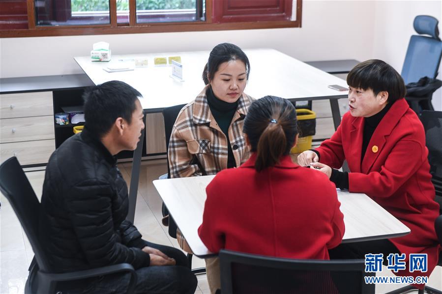 11月29日,“平安大姐”陈玉华(右一)在织里镇社会治理综合服务中心的调解室内对一起加工厂因加工童装质量差而导致业主亏损的纠纷进行调解。新华社记者 徐昱 摄