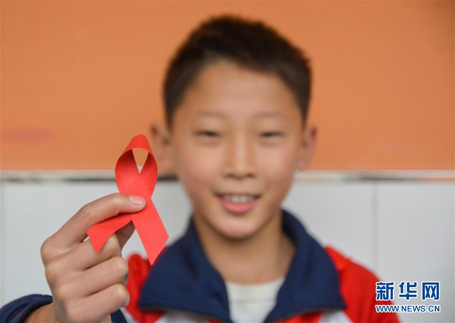 11月29日,河北邯郸市邯山区光明南小学学生展示制作的红丝带。 12月1日是世界艾滋病日,河北多所中小学举办预防艾滋病宣传教育活动,提高学生对艾滋病传播和危害的认识。 新华社发(李昊摄)