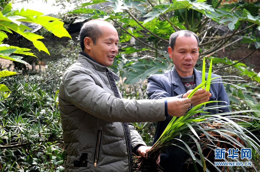 11月28日,在广西荔浦市大安村,韦从刚(左)与脱贫户龙连任交流兰花种植技术。新华社记者 冯为民摄