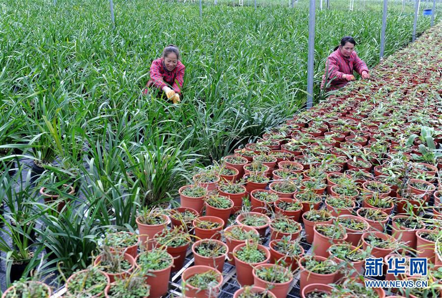 11月28日,荔浦市双江镇永坪村兰花种植示范基地,花农在查看兰花生长情况。新华社记者 冯为民摄