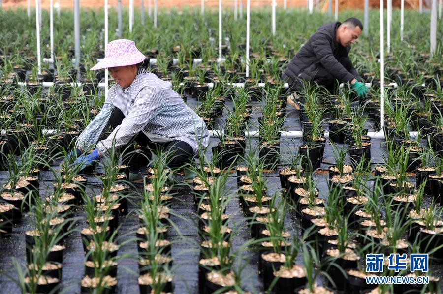 11月28日,荔浦市双江镇永坪村兰花种植示范基地,花农在查看兰花生长情况。新华社记者 冯为民摄