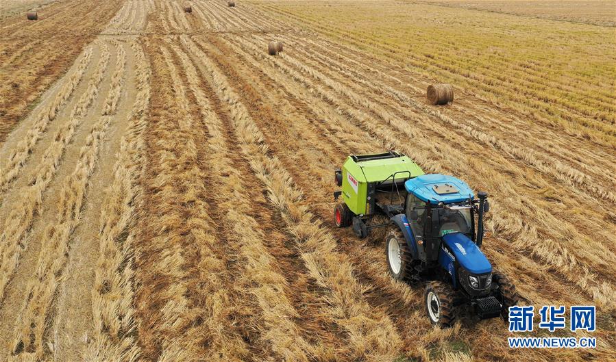 11月29日,在江西省南昌市南昌县蒋巷镇,秸秆回收企业的工作人员在稻田里将秸秆进行集中回收(无人机拍摄)。新华社记者 彭昭之 摄