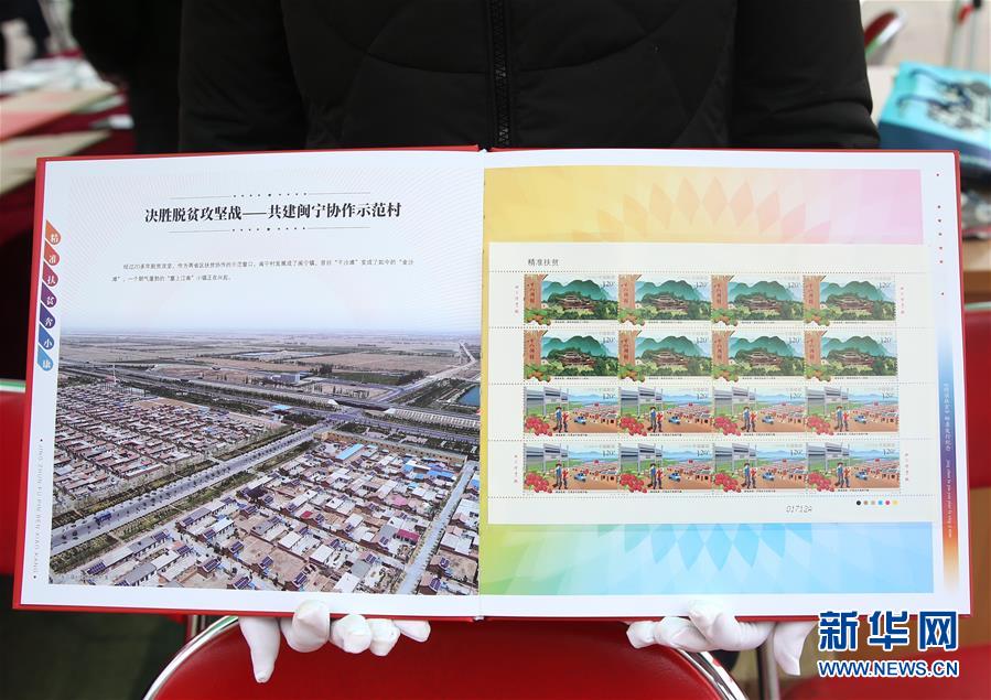 11月29日,工作人员展示《精准扶贫》邮票纪念册。 当日,中国邮政《精准扶贫》纪念邮票在宁夏永宁县闽宁镇举行发行仪式。这套邮票由“大步迈向小康社会”、“福建宁德市赤溪村”、“湖南花垣县十八洞村”、“宁夏永宁县闽宁镇”、“河南兰考县”、“江西井冈山市”六枚邮票组成。 新华社记者 贾浩成 摄