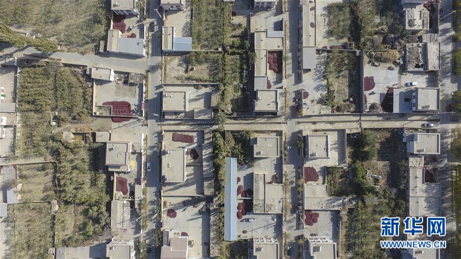这是从空中俯瞰若羌县吾塔木乡尤勒滚艾日克村,家家户户开始晾晒红枣(10月31日无人机拍摄)。新华社记者 赵戈 摄