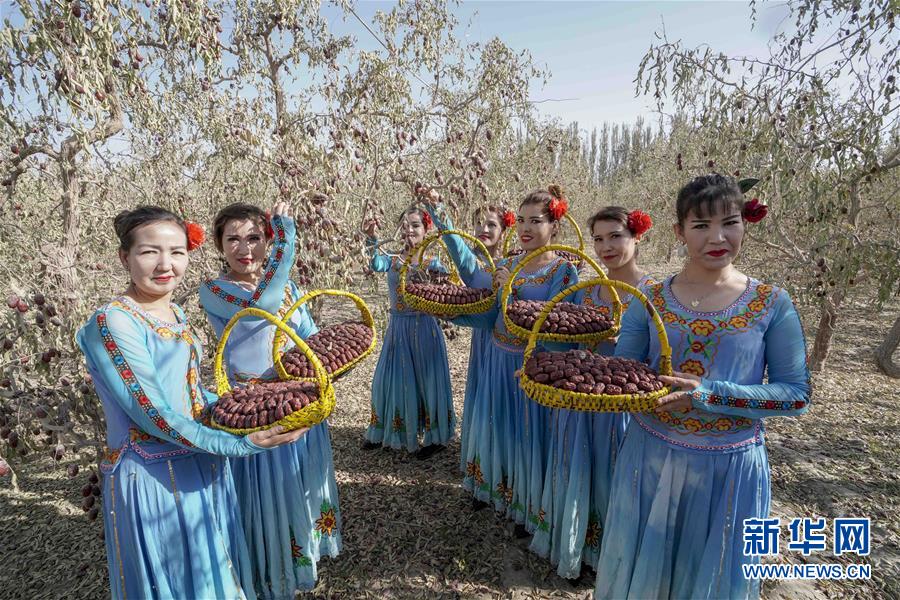 新疆若羌县吾塔木乡万亩红枣园里,身穿民族服装的枣农在展示丰收的红枣(10月31日摄)。新华社记者 赵戈 摄