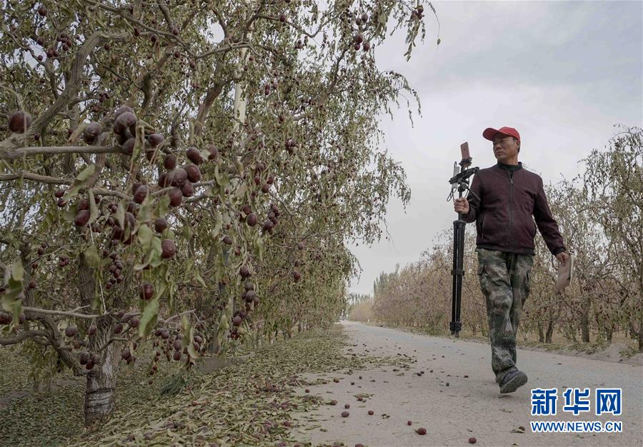 在若羌县吾塔木乡尤勒滚艾日克村一处枣园里,枣农陈晓明在进行网络直播(10月29日摄)。新华社记者 赵戈 摄