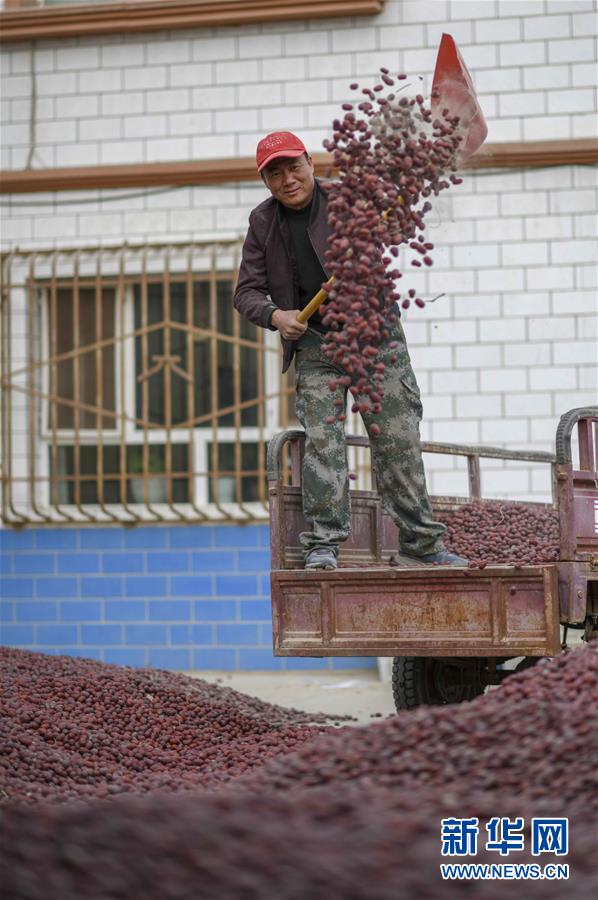 在若羌县吾塔木乡尤勒滚艾日克村的家里,枣农陈晓明在晾晒刚摘好的红枣(10月29日摄)。新华社记者 赵戈 摄