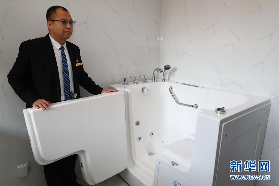 11月25日,在辽宁抚顺东华园社区,工作人员展示专门为行动不便的老人准备的多功能浴缸。新华社记者 龚兵 摄