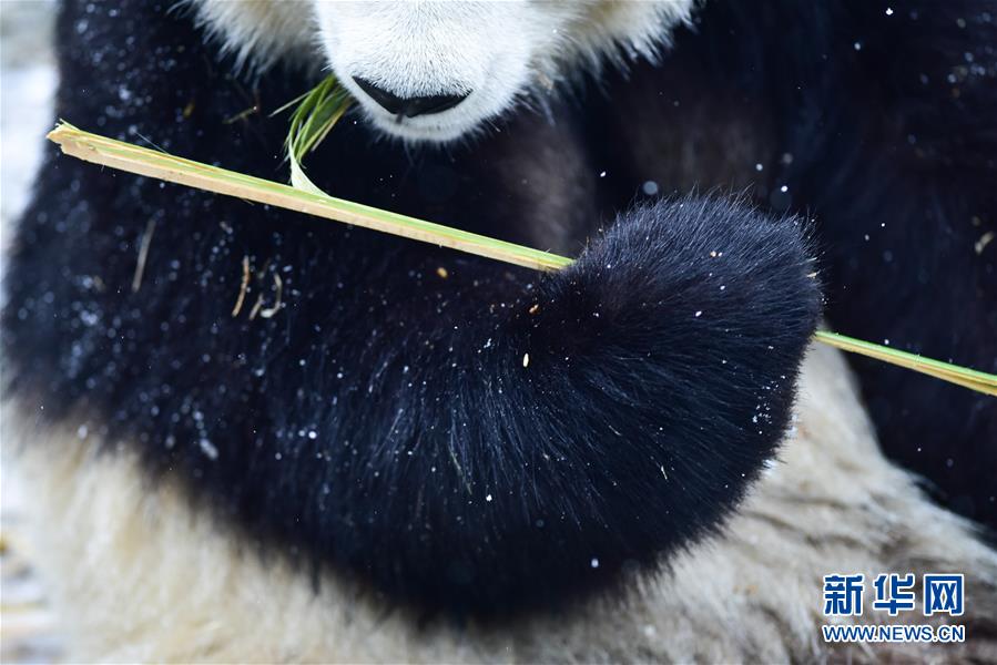 11月29日,在西宁熊猫馆内,一只大熊猫在吃竹子。 当日,青海省西宁市迎来降雪,西宁熊猫馆四只“萌宠”大熊猫在雪天里享受着吃竹子的乐趣。据了解,大熊猫生活的适宜温度在26摄氏度至零下5摄氏度之间,冬季气温低于零下5摄氏度时,场馆会启用保暖设施。 新华社记者 吴刚 摄