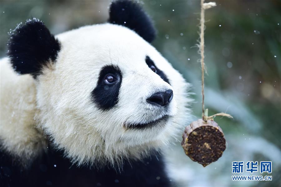 11月29日,在西宁熊猫馆内,一只大熊猫望向饲养员投送的食物。 当日,青海省西宁市迎来降雪,西宁熊猫馆四只“萌宠”大熊猫在雪天里享受着吃竹子的乐趣。据了解,大熊猫生活的适宜温度在26摄氏度至零下5摄氏度之间,冬季气温低于零下5摄氏度时,场馆会启用保暖设施。 新华社记者 吴刚 摄