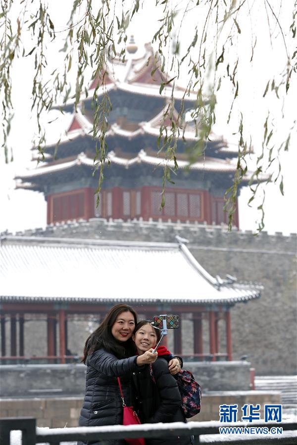 11月30日,人们在雪后的故宫角楼附近拍照。 11月29日起,北京市出现大范围降雪,积雪覆盖了北京城区,为人们带来了惊喜。 新华社记者 沈伯韩 摄