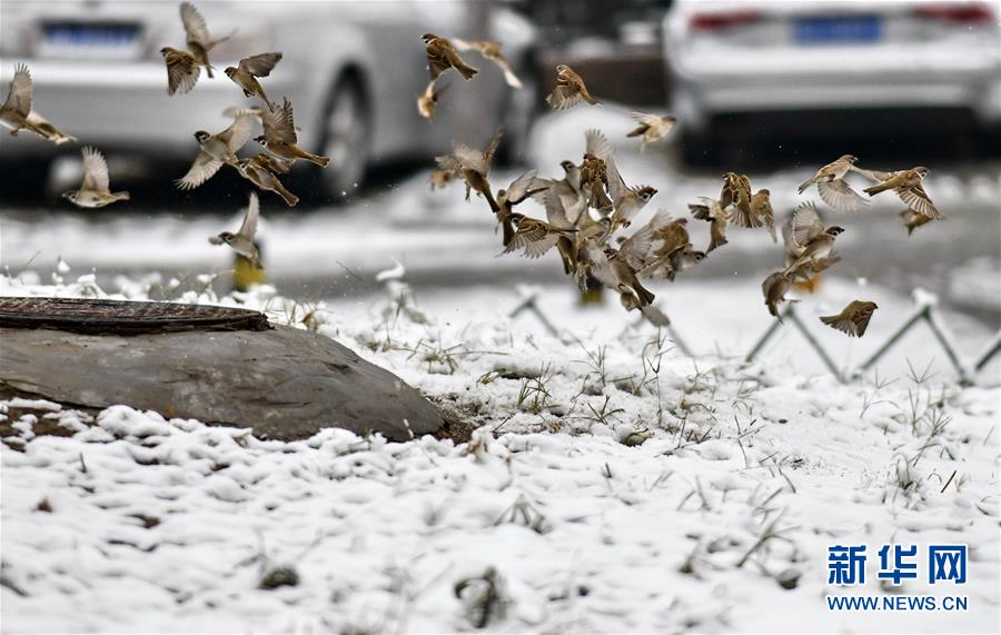 11月30日拍摄的在雪中觅食的麻雀。 11月29日起,北京市出现大范围降雪,积雪覆盖了北京城区,为人们带来了惊喜。 新华社记者 李欣 摄
