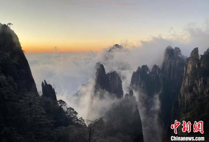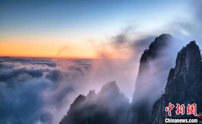 傍晚时分,天边云彩颜色鲜艳,为黄山风光增色。 姚育青 摄