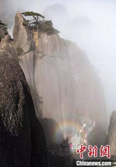 云海出现,往往伴随而来的还有“佛光”景观。近日,在阳光投射之下,黄山风景区一处石壁上出现“佛光”。 毕俊 摄