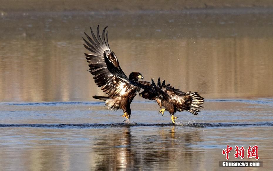 11月30日,一对金雕在新疆焉耆县境内的开都河栖息,似乎在河面抓捕小鱼,目光锐利。近几年来,新疆焉耆县开都河周围生态环境,取得一定的成效,当地在野生动物保护和宣传方面多管齐下,野生动物逐年增多。金雕属于国家一级保护动物。金雕(学名:Aquilachrysaetos)属于鹰科,是北半球上一种广为人知的猛禽。主要栖息于草原、荒漠、河谷,特别是高山针叶林中觅食。确·胡热摄