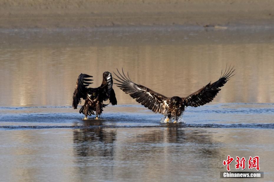 11月30日,一对金雕在新疆焉耆县境内的开都河栖息,似乎在河面抓捕小鱼,目光锐利。近几年来,新疆焉耆县开都河周围生态环境,取得一定的成效,当地在野生动物保护和宣传方面多管齐下,野生动物逐年增多。金雕属于国家一级保护动物。金雕(学名:Aquilachrysaetos)属于鹰科,是北半球上一种广为人知的猛禽。主要栖息于草原、荒漠、河谷,特别是高山针叶林中觅食。确·胡热摄