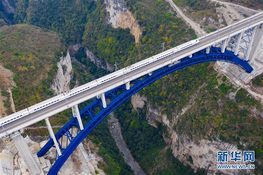 12月2日,一辆试验列车驶过成贵高铁西溪河大桥(无人机拍摄)。新华社记者 刘续 摄