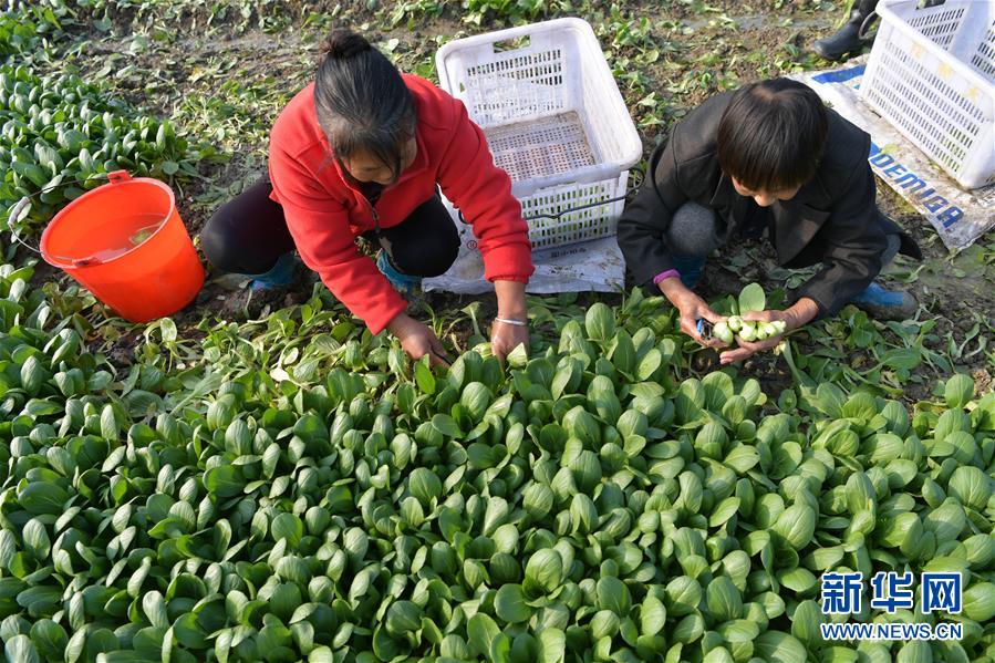 12月2日,在江西省萍乡市上栗县赤山镇大院村,当地农户在蔬菜种植扶贫基地内采摘刚成熟的上海青。 近年来,江西省萍乡市上栗县赤山镇为农户拓宽产业路径,充分利用辖区内水田纵横的优势,大力发展蔬菜种植业,引进上海青、西芹、辣椒、莴笋等12个品种,四季出菜,让农民“冬闲不闲”。农产品通过直销包销的方式与城区各大餐饮酒店对接,让新鲜蔬菜直接上餐桌,帮助当地农民脱贫增收。 新华社记者 彭昭之 摄
