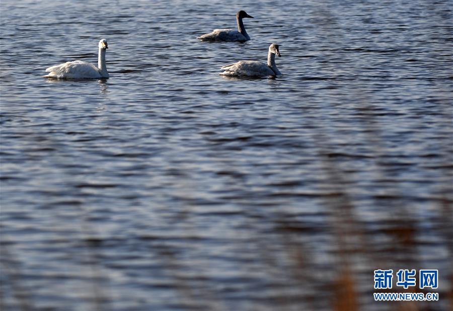 12月3日,天鹅在天津北大港湿地自然保护区栖息。 近日,天津北大港湿地自然保护区迎来大批到此栖息的候鸟。 新华社记者 李然 摄