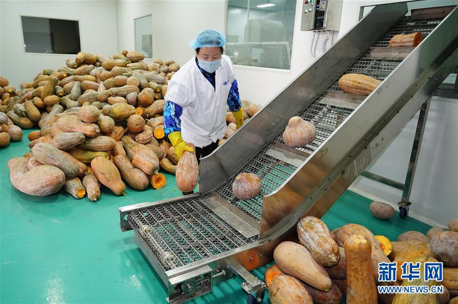 12月3日,在汉滨区五里工业集中区一家南瓜加工企业车间内,工人将南瓜放入加工生产线。新华社记者 邵瑞 摄