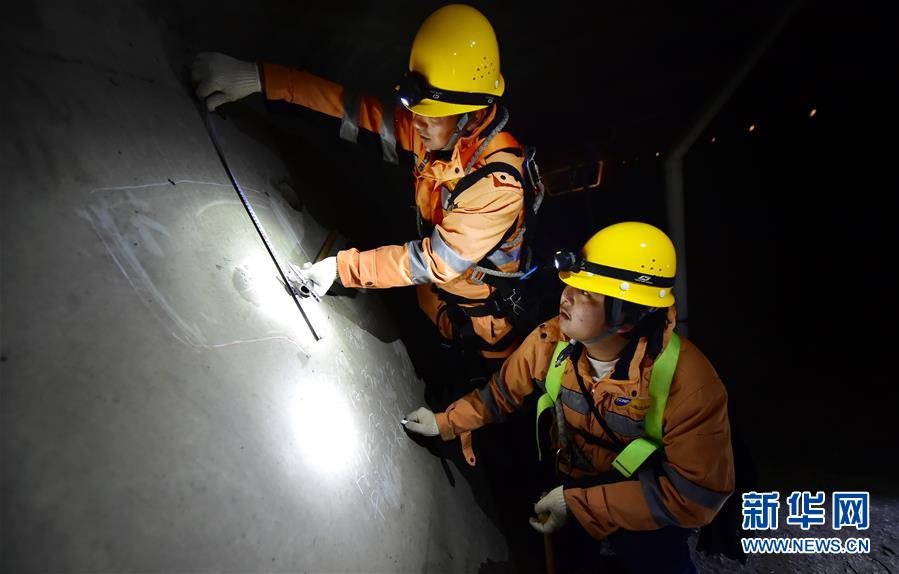 高铁桥隧工在京沪高铁线路上的丹昆特大桥箱梁内对梁体“病害”做标记(12月3日摄)。 新华社发(张诗影 摄)