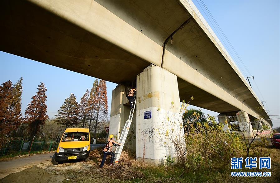 高铁桥隧工登上京沪高铁线路上的丹昆特大桥对梁体进行检测维护(12月3日摄)。 新华社发(张诗影 摄)