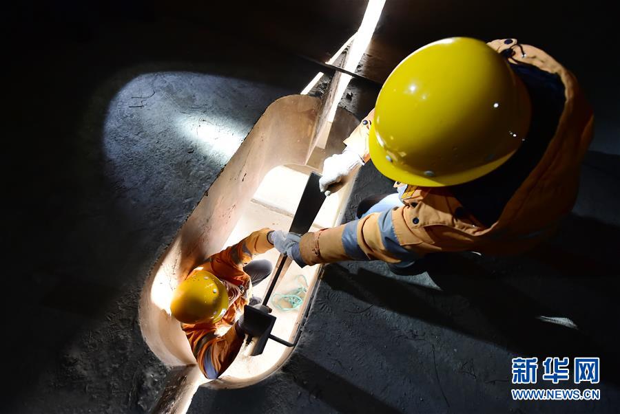 高铁桥隧工登上京沪高铁线路上的丹昆特大桥箱梁内对梁体进行检测维护(12月3日摄)。 新华社发(张诗影 摄)